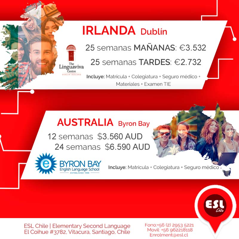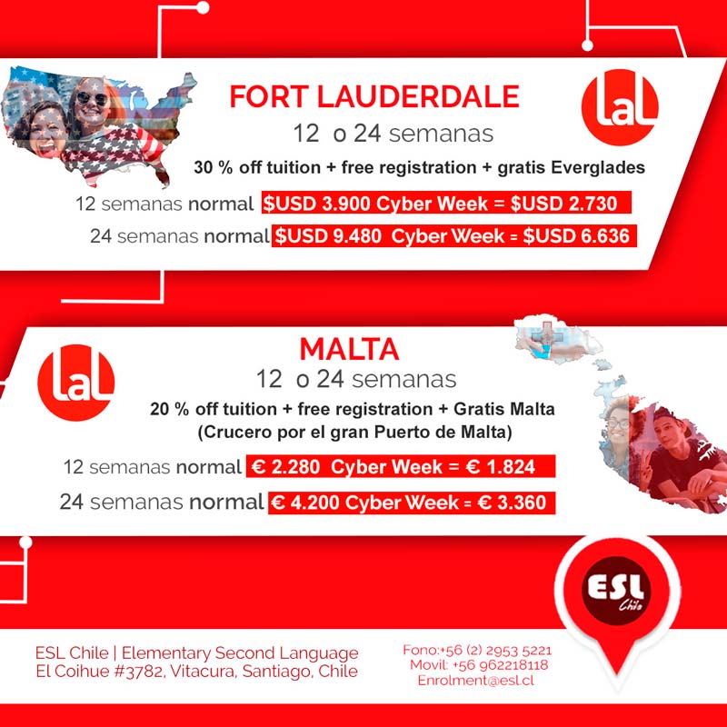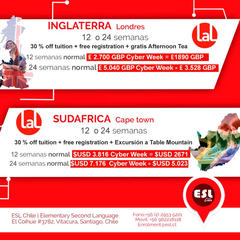 ESL Chile se une al Cyber Week 2019. A partir de este lunes 27 hasta el 31 de mayo, ESL Chile se une al Cyber Week 2019 , para brindarte excelentes descuentos, en las escuelas más importantes del mundo, para que aprendas inglés en el extranjero.